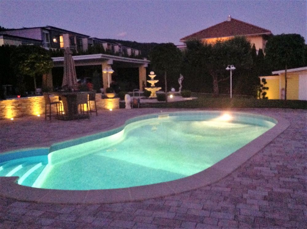 Neben einem Saunabereich wurde der gesamte Garten liebevoll bepflanzt, eine Mauer als Trennelement zwischenSwimming Pool und Liegefläche angelegt sowie der Boden rundum den Swimming Pool mithochwertigen Pflastersteinen verlegt.